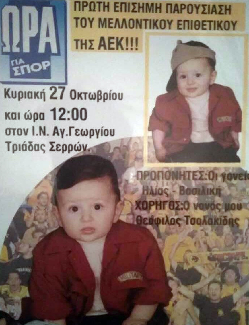 Οι γονείς του χτύπησαν «διάνα», όπως αποκαλύπτει το προσκλητήριο για τη στιγμή που θα έμπαινε στην κολυμπήθρα. Στο προσκλητήριο το οποίο δημοσιοποίησε η ιστοσελίδα enwsi.gr, που μοιάζει σαν πρωτοσέλιδο της «Ωρας των Σπορ», αναφέρεται: «Πρώτη επίσημη παρουσίαση του νέου επιθετικού της ΑΕΚ. Προπονητές: Οι γονείς του Ηλίας και Βασιλική. Χορηγός: Ο νονός του».