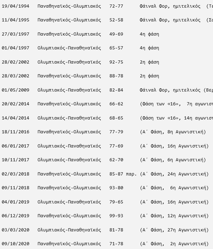 Τα τέσσερα «διπλά» του Ολυμπιακού: Η πρώτη φορά ήταν στις 27 Μαρτίου 1997, όταν η ομάδα του Πειραιά νίκησε στο «σπίτι» του τον Παναθηναϊκό με 49-69 για την 4η φάση. Η δεύτερη εκτός έδρας νίκη του Ολυμπιακού σε ευρωπαϊκή «μητέρα των μαχών» καταγράφηκε στις 18 Νοεμβρίου 2016 (77-79), στο πλαίσιο της 8ης αγωνιστικής της πρώτης φάσης. Η τρίτη ήταν στις 2 Μαρτίου (85-87 παρ.), για την 24η αγωνιστική της κανονικής περιόδου. Η τέταρτη και τελευταία φορά που έφυγε νικητής ο Ολυμπιακός από την έδρα των «πρασίνων» σημειώθηκε στις 9 Οκτωβρίου 2020 (71-78) για τη 2η αγωνιστική.