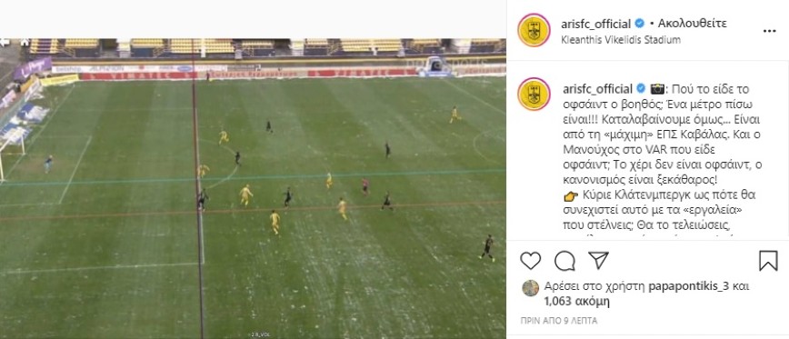 «Πού το είδε το οφσάιντ ο βοηθός; Ένα μέτρο πίσω είναι!!! Καταλαβαίνουμε όμως… Είναι από τη «μάχιμη» ΕΠΣ Καβάλας. Και ο Μανούχος στο VAR που είδε οφσάιντ; Το χέρι δεν είναι οφ σάιντ, ο κανονισμός είναι ξεκάθαρος! Κύριε Κλάτενμπεργκ ως πότε θα συνεχιστεί αυτό με τα «εργαλεία» που στέλνεις; Θα το τελειώσεις, επιτέλους, αυτό το «έργο»; Φτάνει…», ανέφερε το μήνυμα των Θεσσαλονικέων, οι οποίοι το συνόδευσαν και με φωτογραφία από τη φάση που δόθηκε οφσάιντ.