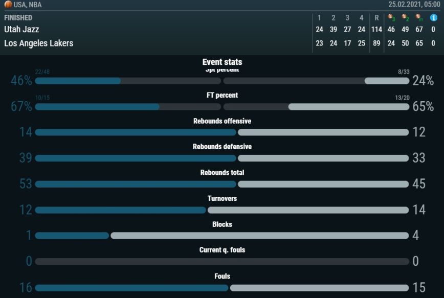 Η ομάδα της Γιούτα επικράτησε με το εμφατικό 114-89, έφτασε στο 26-6, παραμένοντας όχι μόνο στην κορυφή του πρωταθλήματος, αλλά ούσα και η μοναδική που έχει μονοψήφιο αριθμό ηττών.