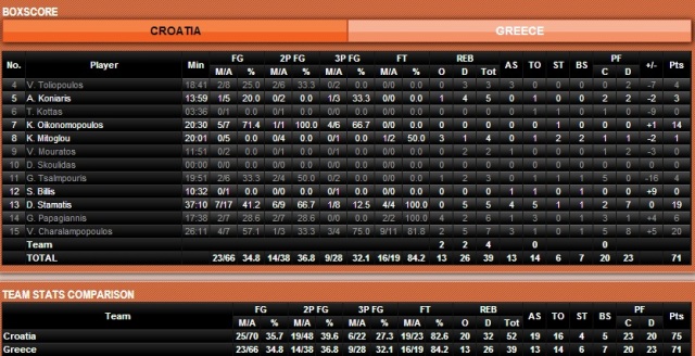 Η Εθνική κατάφερε να ανακτήσει το προβάδισμα μετά από τριάμισι λεπτά στο δεύτερο ημίχρονο (34-35) και να φτάσει στους τρεις (41-44), αλλά το τέταρτο φάουλ του Χαραλαμπόπουλου ήταν μια πολύ κακή είδηση. Ο Οικονομόπουλος πρόσφερε πολλές λύσεις με τα μακρινά του σουτ (50-52) στο δεκάλεπτο που ολοκληρώθηκε με την Κροατία μπροστά, 54-52. Ένα 6-0 στο πρώτο δίλεπτο της τελευταίας περιόδου έφερε την Ελλάδα στο -8 (60-52), αλλά πλησίασε γρήγορα στους τρεις (60-57), όταν όμως έχασε τον Χαραλαμπόπουλο με πέμπτο φάουλ, εξίμισι λεπτά πριν το τέλος. Παρά τις προσπάθειες του Σταμάτη (65-61) οι επιθετικές λύσεις ήταν περιορισμένες και η αποβολή (και) του Τσαλμπούρη δεν βοήθησε την κατάσταση. Το τρίποντο του Κόνιαρη 104’’ πριν το τέλος έδωσε ελπίδες στην Εθνική (73-68). Ο Οικονομόπουλος με το τέταρτο τρίποντό του μείωσε στο καλάθι (73-71) στα 7,1’’ για τη λήξη, αλλά ο Αράποβιτς δεν έκανε λάθος στις βολές και όλα τελείωσαν.