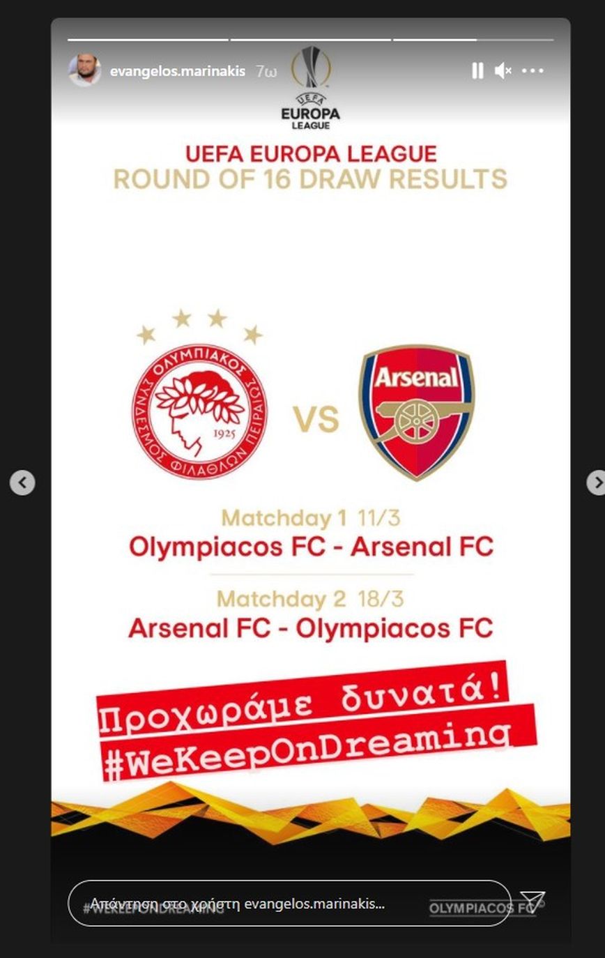 Ο Βαγγέλης Μαρινάκης έγραψε στο Instagram του μετά την κλήρωση του Ολυμπιακού με την Άρσεναλ: «Προχωράμε δυνατά. Συνεχίζουμε να ονειρευόμαστε»!