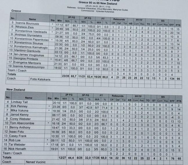 Ζήσης, Βασιλειάδης, Παπανικολάου, Πρίντεζης και Μπουρούσης ήταν η αρχικά πεντάδα για την Εθνική. Το ελληνικό ξεκίνημα ήταν νωθρό στην άμυνα (4-7), αλλά ο αρχηγός με 10 πόντους στο πρώτο δεκάλεπτο έδωσε λύσεις φέρνοντας την ομάδα του ακόμη και στο +7 (25-18). Τα μετόπισθεν συνέχιζαν να κάνουν… νερά κι όταν «κόλλησε» και η επίθεση, η Νέα Ζηλανδία με τους Πένι και Φοτού γύρισε το παιχνίδι (26-28). Ο Μπουρούσης πήρε πάνω του την υπόθεση με διαδοχικούς πόντους και ήταν αυτός που με τρίποντο διαμόρφωσε στην εκπνοή του ημιχρόνου το 50-48.