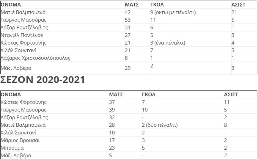 Ο Ματιέ Βαλμπουενά αν αθροίσουμε γκολ και ασίστ μπορεί να ξεπερνά τον Μασούρα, αλλά δεν πρέπει να ξεχνάμε ότι τα από τα έντεκα γκολ που έχει βάλει με την «ερυθρόλευκη» φανέλα, τα εννέα είναι με πέναλτι. Του Μασούρα, αντίθετα, κανένα δεν είναι από την άσπρη βούλα.