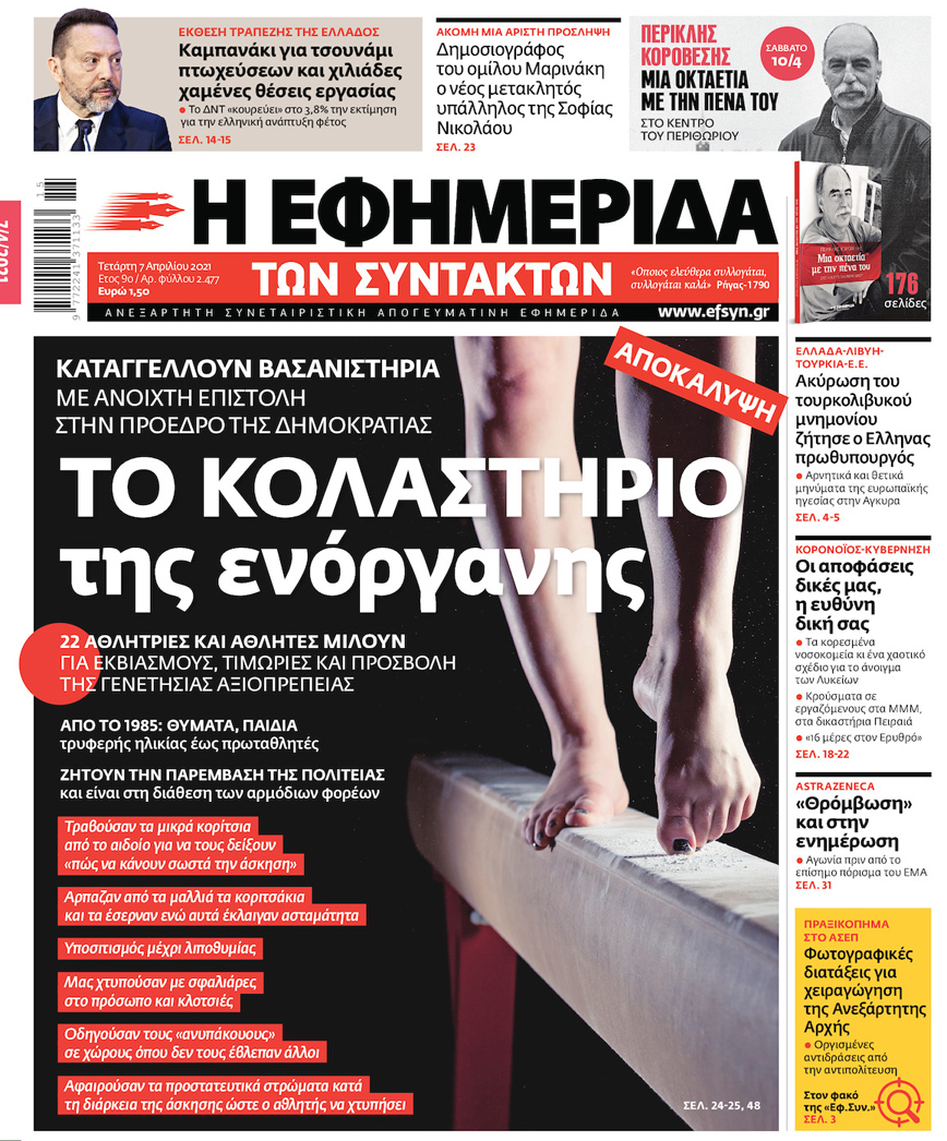 Επιστολή στην Πρόεδρο της Δημοκρατίας Κατερίνα Σακελλαροπούλου και τον πρωθυπουργό Κυριάκο Μητσοτάκη έστειλαν αθλητές της ενόργανης γυμναστικής για τη λεκτική βία και τις σεξουαλικές παρενοχλήσεις που υπέστησαν. Ζητούν την παρέμβαση της πολιτειακής και πολιτικής ηγεσίας, ώστε να εξυγιανθεί το άθλημα τους και «να βγει από τη σκιά της σκληρότητας και της κακοποίησης»