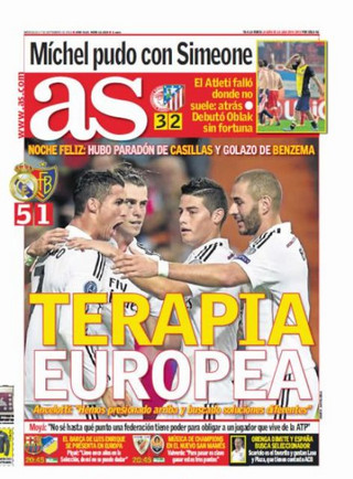 Η άλλη εφημερίδα της Μαδρίτης, η As «παίζει» και αυτή στο εξώφυλλο της την πεντάρα της Ρεάλ και ψηλά – ψηλά γράφει: «Ο Μίτσελ μπορούσε με τον Σιμεόνε», ρίχνοντας προφανώς μπηχτή και για την σαββατιάτικη ήττα της Ρεάλ από την Ατλέτικο στο «Σαντιάγκο Μπερναμπέου». Πάντως, και η As ασχολείται με τον Ομπλακ που επιλέχτηκε από τον Σιμεόνε ως βασικός πορτιέρο.