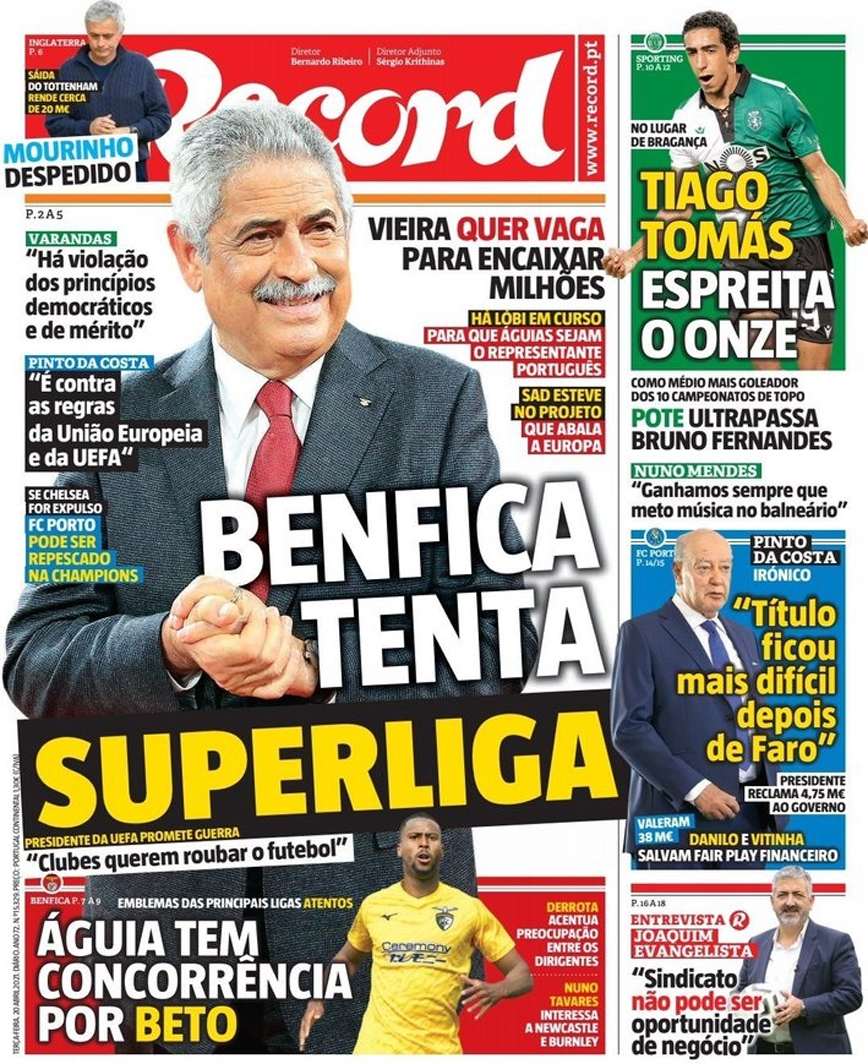 Ωστόσο, η μεγάλη αντίπαλος των «δράκων» στην Πορτογαλία, Μπενφίκα, εξετάζει σοβαρά το ενδεχόμενο να ενταχθεί στην European Super League. Όπως αναφέρει στο πρωτοσέλιδό της η Record, η διοίκηση του κλαμπ της Λισαβόνας έχει σχετική πρόταση στα χέρια της και είναι πολύ πιθανό να την κάνει αποδεκτή.