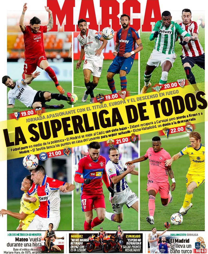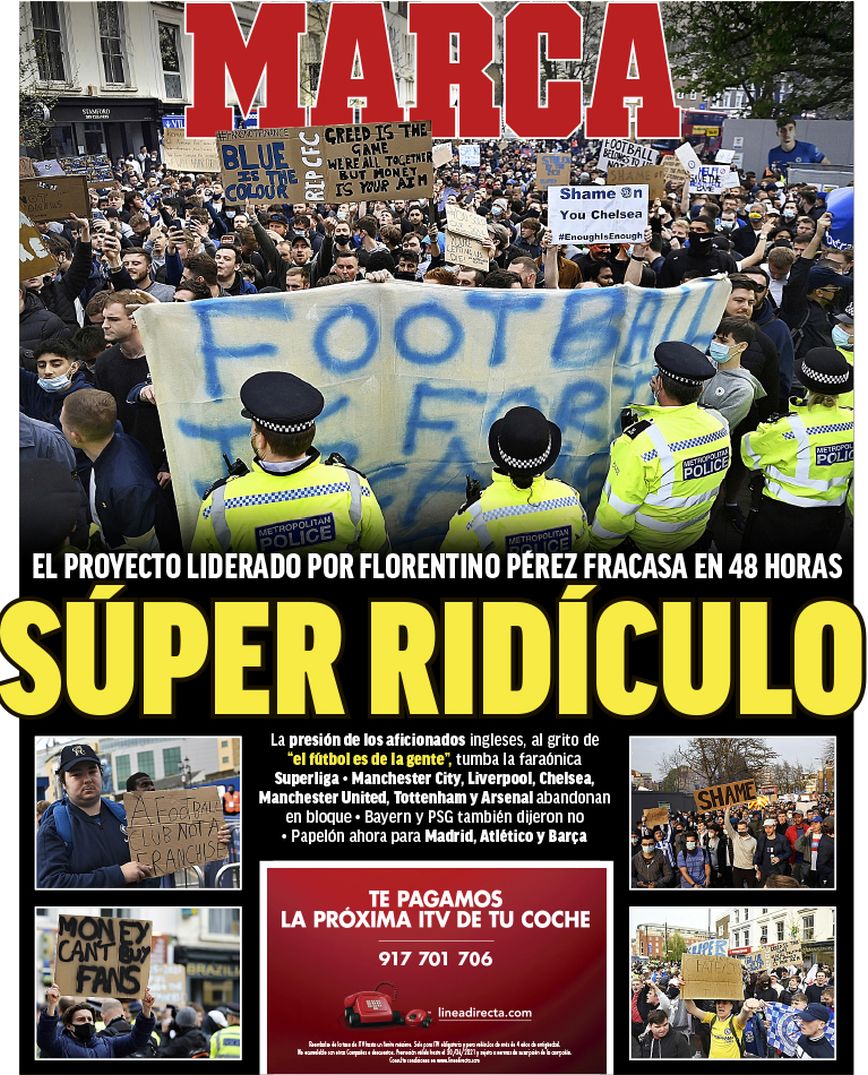 Μάλιστα, η UEFA φέρεται να τους έδωσε αρκετά χρήματα για να αποχωρήσουν από αυτό το πλάνο. Η Μπαρτσελόνα και η Μίλαν είναι έτοιμες για το «αντίο», όπως και η Ατλέτικο Μαδρίτης. To διπλό πρωτοσέλιδο της Μarca τα λέει όλα «Super… ξεφτίλα. Το πρότζεκτ με ηγέτη τον Φλορεντίνο Πέρεθ αποτυγχάνει σε 48 ώρες».