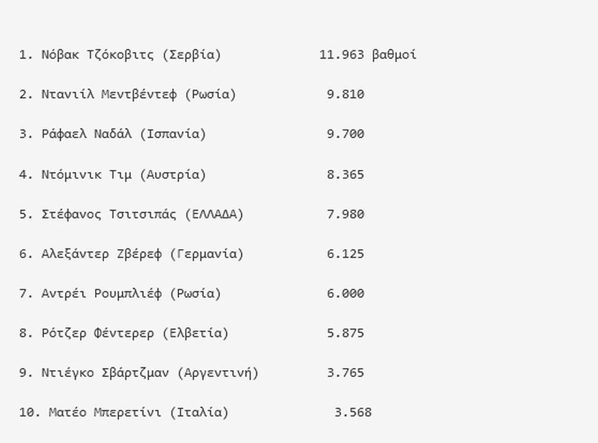 Επικεφαλής της κατάταξης παραμένει ο Νόβακ Τζόκοβιτς, ακολουθεί ο Ντανίιλ Μεντβέντεφ, ενώ τρίτος είναι ο Ραφαέλ Ναδάλ.