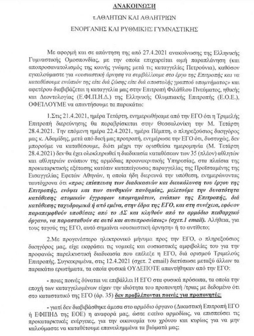 Με μια σκληρή ανακοίνωσή τους, 35 αθλητές και αθλήτριες της γυμναστικής επιτίθενται στην ελληνική ομοσπονδία για τη στάση της μετά τις καταγγελίες για κακοποίηση.