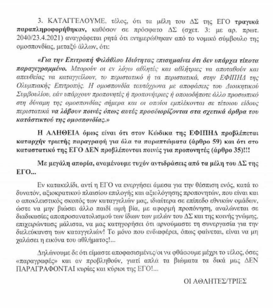 Συνέπεια αυτής της ανακοίνωσης της ΕΓΟ, ήταν να βγάλουν τώρα μία και 35 αθλητές και αθλήτριες, κατηγορώντας τη διοίκηση της ομοσπονδίας και προναγγέλοντας ότι θα τραβήξουν το θέμα ως το τέλος, όσες παραγραφές κι αν προβληθούν.
