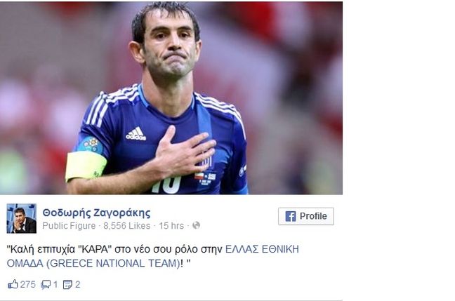 Δεν θα μπορούσε όμως να μην ευχηθεί στον φίλο και άλλοτε συμπαίκτη του τα καλύτερα, μετά την συμφωνία ν’ αναλάβει πόστο στην Εθνική ομάδα.