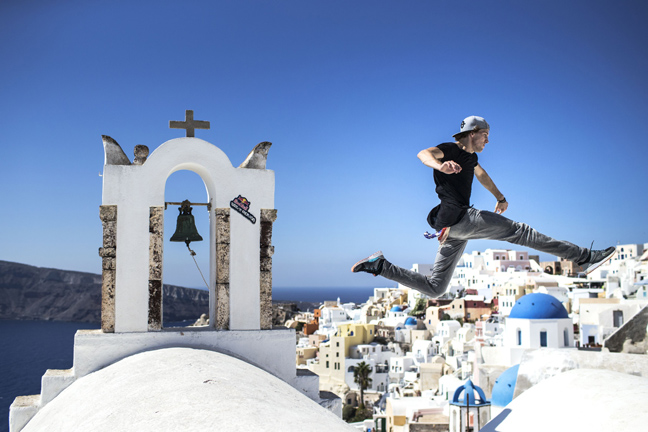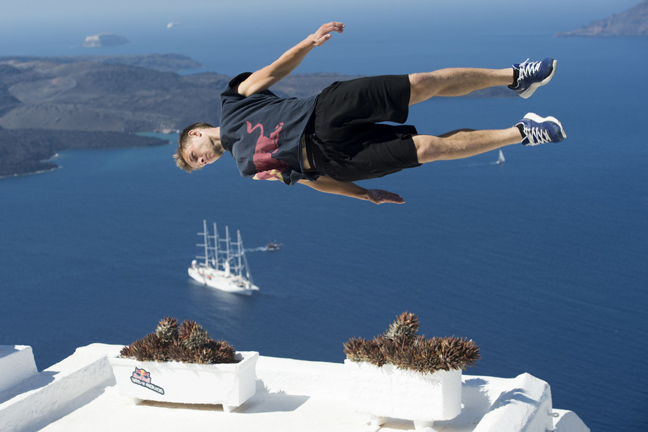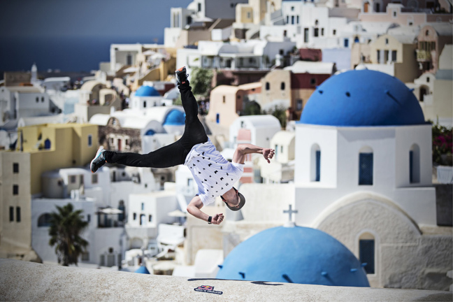 Στη Σαντορίνη, με φόντο τα ηφαιστειακά πετρώματα της Καλντέρας, το απέραντο γαλάζιο και τις λευκές κυκλαδίτικες στέγες, έξι από τους καλύτερους αθλητές freerunning στον πλανήτη προετοιμάζουν το έδαφος για την αναμέτρηση που θα καταπλήξει τα πλήθη αυτό το Σάββατο, 4 Οκτωβρίου, στις 16:00.