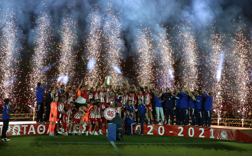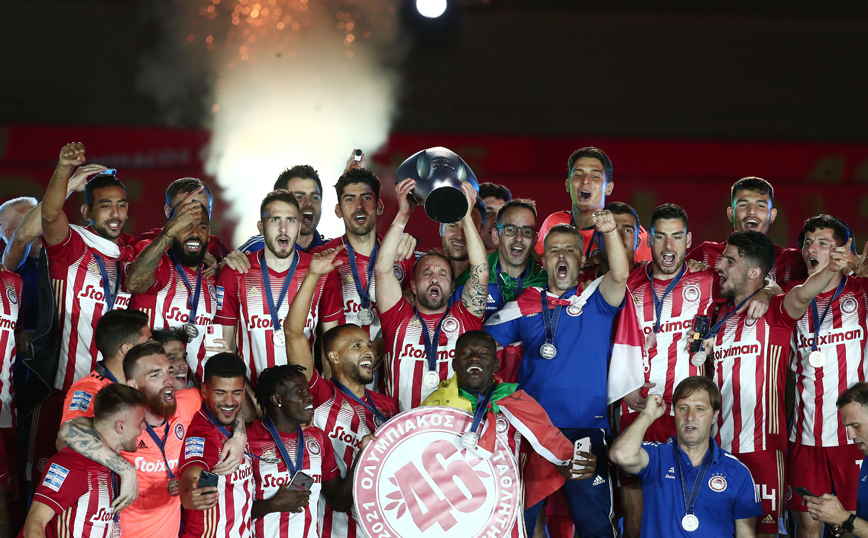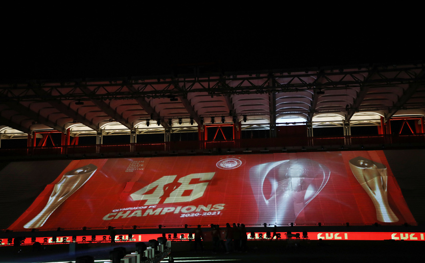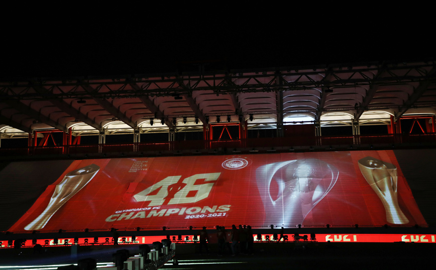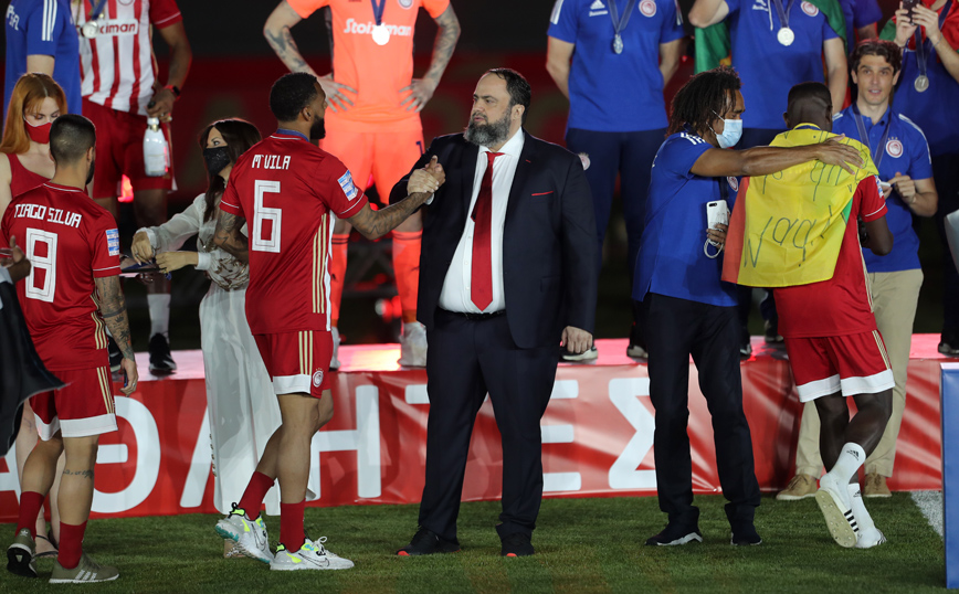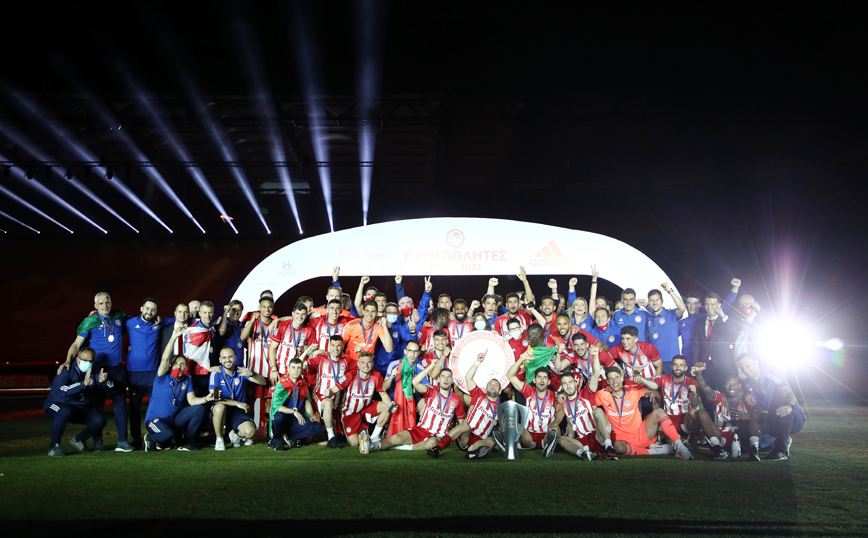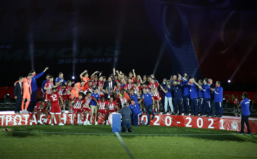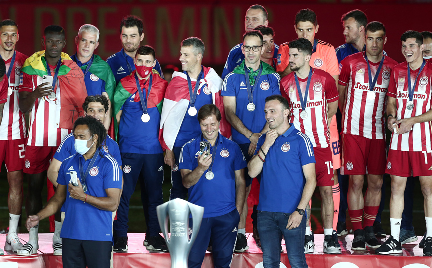 Ο τίτλος είχε εξασφαλιστεί και μαθηματικά, αλλά άπαντες περίμεναν την απονομή του τροπαίου για να το πανηγυρίσουν. Και το πανηγύρισαν. Μπορεί ο κόσμος να απουσίαζε από τις εξέδρες -δίνοντας όμως δυναμικό παρών έξω από το Καραϊσκάκη- αλλά ο Πέδρο Μαρτίνς και οι παίκτες του, μαζί με τον Βαγγέλη Μαρινάκη, έστησαν το δικό τους πάρτι μέσα σε αυτό.