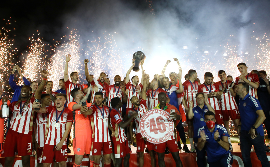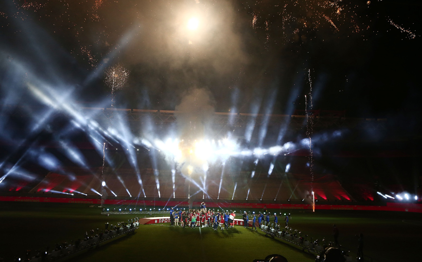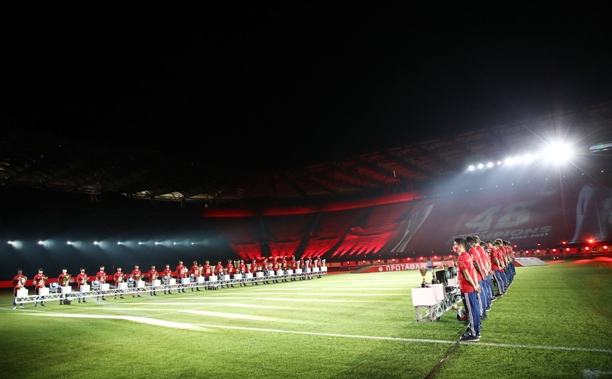 Η ώρα της απονομής έφτασε για τον Ολυμπιακό, ο οποίος πανηγύρισε στο Καραϊσκάκη για το 46ο πρωτάθλημα της ιστορίας του.