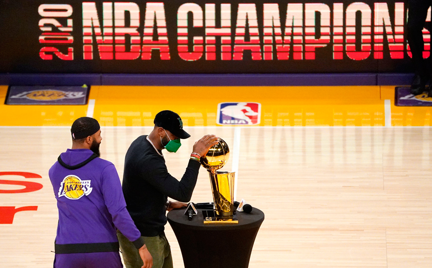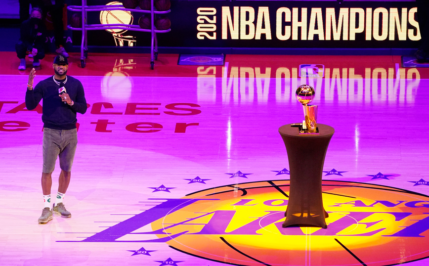 Πριν από το τζάμπολ του αγώνα με τους Χιούστον Ρόκετς, οι Λος Άντζελες Λέικερς έκαναν τα αποκαλυπτήρια του banner για την κατάκτηση του πρωταθλήματος.