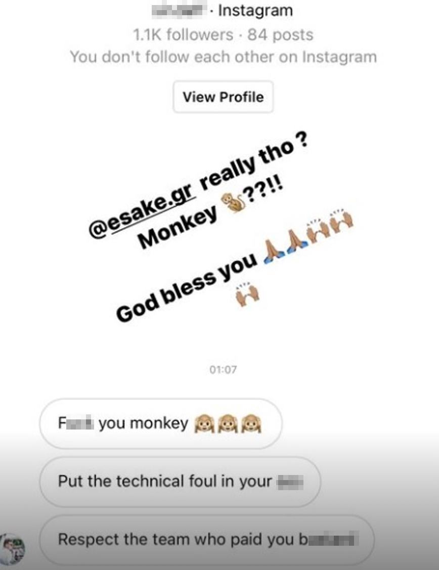 «Άντε @@@@, μαϊμού! Βάλε την τεχνική ποινή στον @@ σου! Σεβάσου την ομάδα που σε πλήρωσε, μπ@@», ήταν το μήνυμα που έλαβε στο Instagram ο Ανγκολέζος, που έχει περάσει και από τον ΠΑΟΚ. «Μαϊμού; Αλήθεια τώρα; Να σε έχει ο Θεός καλά», έγραψε ο Μορέιρα, ο οποίος τάγκαρε στην ανάρτησή του και τον ΕΣΑΚΕ.
