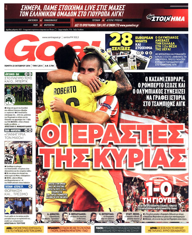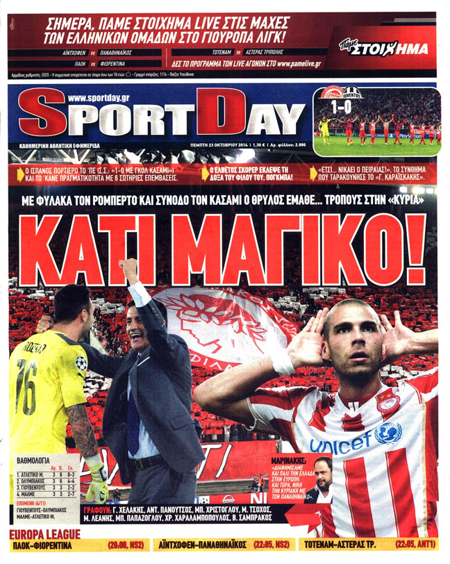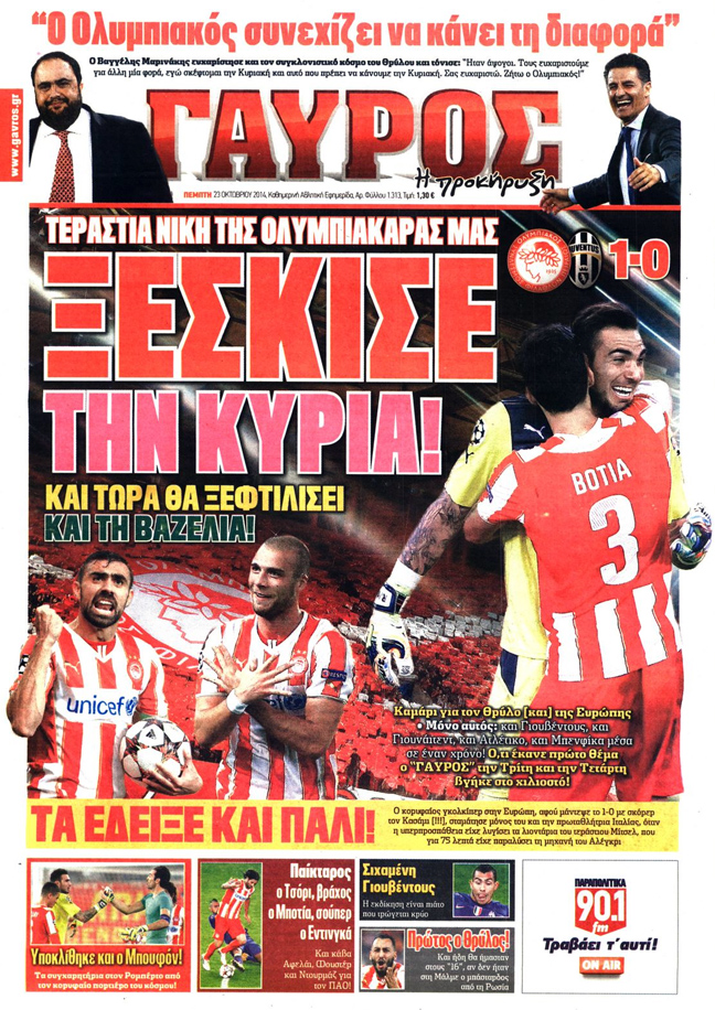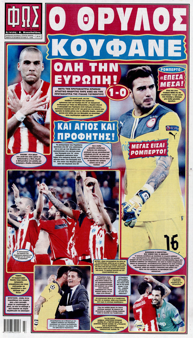 Με διθυραμβικά σχόλια υποδέχθηκαν σήμερα οι αθλητικές εφημερίδες τη χθεσινή μεγάλη νίκη του Ολυμπιακού στο Τσάμπιονς Λιγκ επί της Γιουβέντους με 1-0.