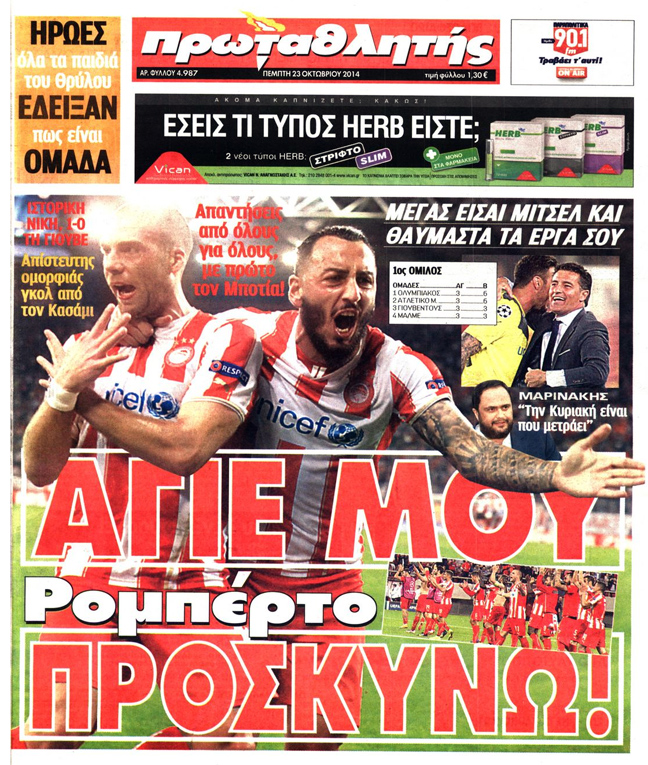Ας δούμε αναλυτικά τα πρωτοσέλιδα των αθλητικών εφημερίδων για το παιχνίδι του Ολυμπιακού: