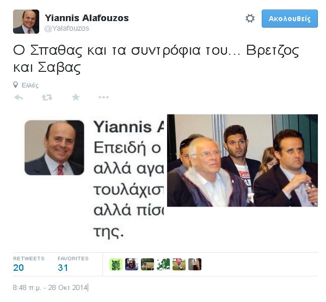 «Τουλάχιστον διαπλεκόμενο» χαρακτηρίζει μέσω twitter τον Ηλία Σπάθα ο Γιάννης Αλαφούζος.