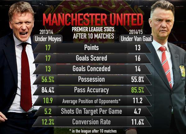 Αν και κανείς δεν μπορεί να αμφισβητήσει την προπονητική αξία του Φαν Χάαλ, ο Ολλανδός σε οκτώ κατηγορίες ηττάται κατά κράτος από τον «αντίπαλο» του, με μόνη εξαίρεση το ποσοστό στις επιτυχημένες πάσες των παικτών της ομάδας.