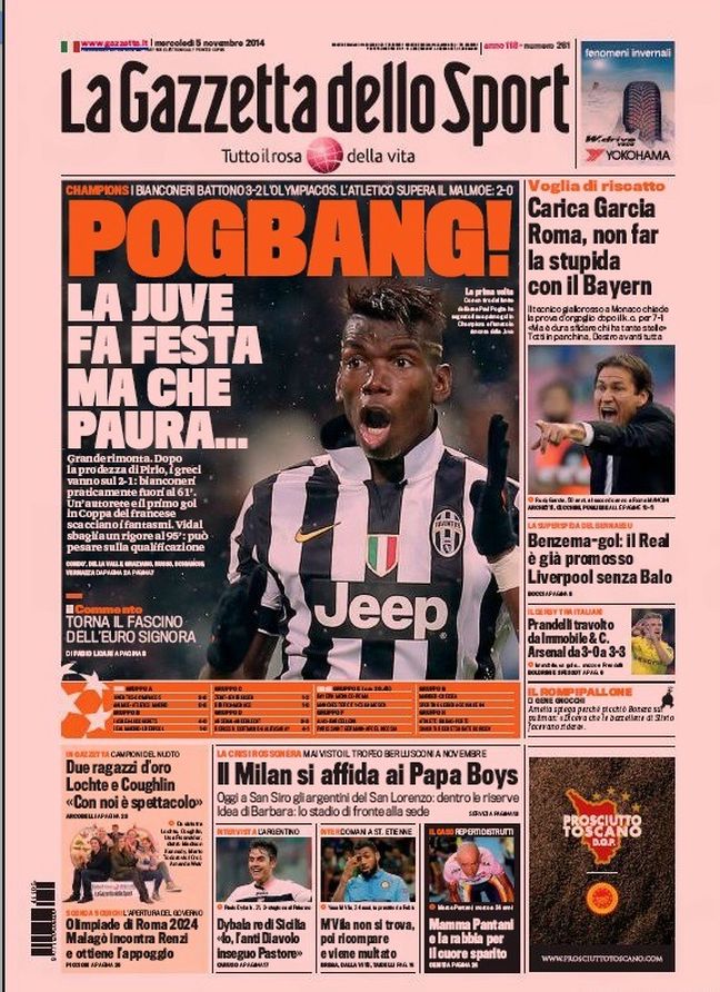 Η Gazzetta dello Sport έχει στο πρωτοσέλιδο της τον Πολ Πογκμπά και γράφει: «Pogbang» με κεφαλαία γράμματα και συνεχίζει: «Η Γιουβέντους νίκησε, αλλά φοβήθηκε»!