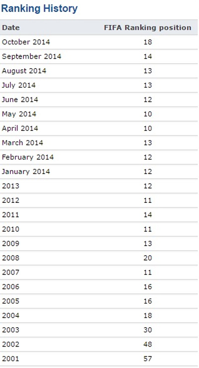 Μάλιστα, εκείνο που προκαλεί μεγαλύτερη εντύπωση είναι πως μετά το 2003 η Εθνική θα είναι κάτω από την 20η θέση, ενώ μετά το τέλος του Μουντιάλ στη Βραζιλία που είχε βρεθεί ανάμεσα στις 16 καλύτερες ομάδες της διοργάνωσης ήταν στη 13η θέση της παγκόσμιας κατάταξης.