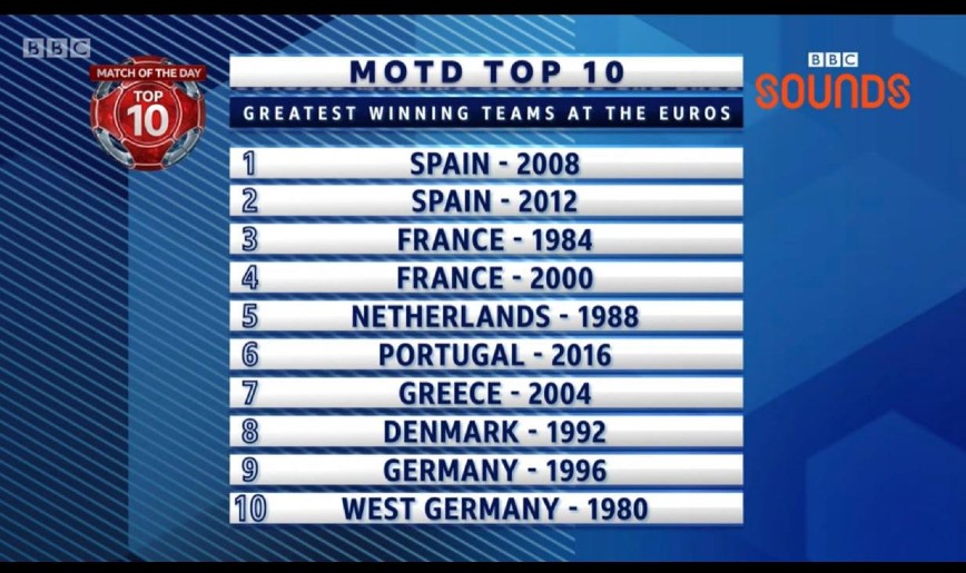 Μία μέρα πριν τον τελικό του Euro 2020 ανάμεσα στην Ιταλία και την Αγγλία, στο BBC αποφάσισαν να κάνουν μια αναδρομή στο παρελθόν. Οι Γκάρι Λίνεκερ και Άλαν Σίρερ, λοιπόν, προσπάθησαν να φτιάξουν το top-10 των ομάδων που κατέκτησαν το τρόπαιο και συμπεριέλαβαν σε αυτό και την εθνική Ελλάδας που έκανε το απίθανο το 2004 στα πορτογαλικά γήπεδα.