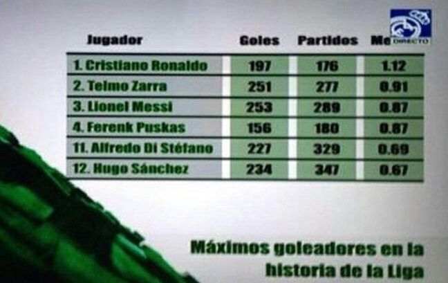 Στο κανάλι της πρόβαλε έναν πίνακα με τίτλο «κορυφαίοι σκόρερ στην ιστορία της La Liga», που βγάζει πρώτο τον Κριστιάνο Ρονάλντο μετρώντας τον μέσο όρο γκολ των ποδοσφαιριστών.