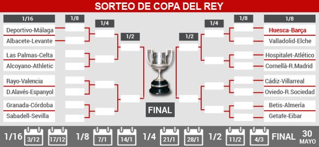 Μάλιστα η «βασίλισσα» ετοιμάζεται για ραντεβού στους «16» με τη συμπολίτισσα Ατλέτικο, εφόσον η τελευταία ξεπεράσει το χαμηλό εμπόδιο της Οσπιταλέτ. Η Μπαρτσελόνα έχει εύκολο έργο κόντρα στην Ουέσκα και στους «16» θα συναντήσει το νικητή του Βαγιαδολίδ-Έλτσε, ωστόσο στα προημιτελικά θα βρει όποιον επιβιώσει από τη μονομαχία των Μαδριλένων.