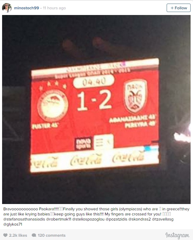 «Μπράβο ΠΑΟΚάρα! Τελικά δείξατε σε αυτά τα… κορίτσια (Ολυμπιακός) ποια είναι η κορυφαία ομάδα στην Ελλάδα. Έκαναν σαν κλαμένα μωρά. Συνεχίστε έτσι παιδιά», αναφέρει μεταξύ άλλων σε σχόλιό του στο Instagram o διεθνής άσος και είχε επισυνάψει τους Αθανασιάδη, Μακ (συμπαίκτες στην εθνική Σλοβακία), Πόζογλου, Ποζατζίδη, Σκόνδρα, Τζαβέλλα και Γλύκο.