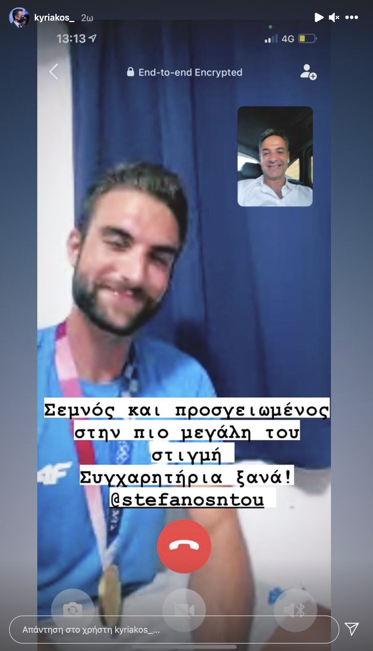 Μάλιστα ο πρόεδρος της κυβέρνησης που βρίσκεται στην Κρήτη, όπως φαίνεται και στο σχετικό φωτογραφικό στιγμιότυπο, πήρε τηλέφωνο την ώρα που βρισκόταν στο αυτοκίνητο, προκειμένου να συνομιλήσει με τον χρυσό ολυμπιονίκη. Όπως έγραψε σχετικά, ο Στέφανος είναι «σεμνός και προσγειωμένος στην πιο μεγάλη στιγμή του. Συγχαρητήρια ξανά!».