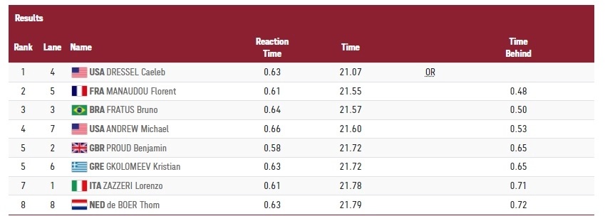 Το χρυσό μετάλλιο κατέκτησε ο απίθανος Αμερικανός Κάλεμπ Ντρέσελ με χρόνο 21.07 (Ολυμπιακό ρεκόρ), το ασημένιο ο Γάλλος Μαναντού (21.55), ενώ ο Βραζιλιάνος Φράτους πήρε την 3η θέση στον τελικό και το χάλκινο μετάλλιο με 21.57.