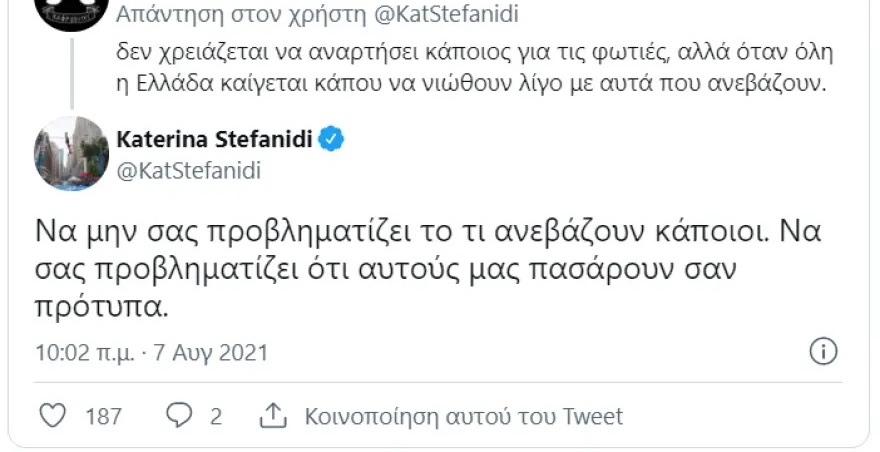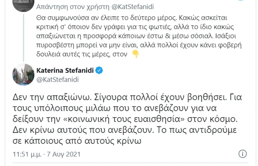 «Φαίνεται κάποιοι να πιστεύουν ότι αν δεν αναρτήσεις για τις φωτιές δεν σε ενδιαφέρουν ενώ αν αναρτήσεις είσαι ισάξιος πυροσβέστη», ήταν το επίμαχο tweet για το οποίο η Στεφανίδη δέχθηκε «βροχή» από απάντησεις.
