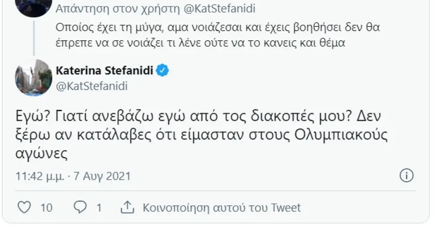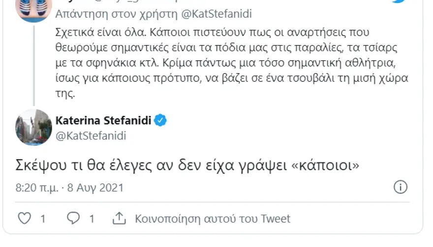 Η Κατερίνα Στεφανίδη πήρε την 4η θέση στο επί κοντώ στους Ολυμπιακούς Αγώνες του Τόκιο, όμως ένα σχόλιό της για τις φωτιές στο twitter προκάλεσε… πόλεμο.