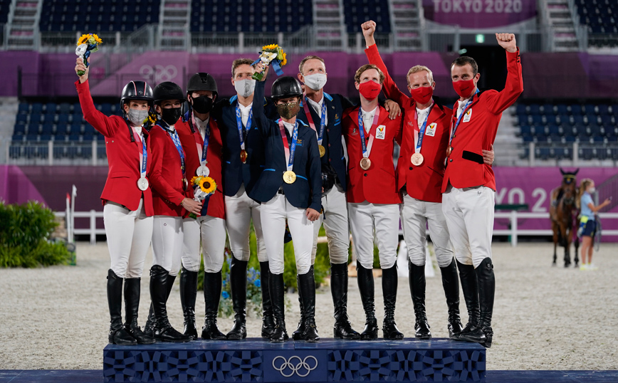 Συγκεκριμένα το χρυσό μετάλλιο κατέκτησε η Σουηδία, οι ιππείς της οποίας (Χένρικ φον Έκερμαν, Μάλιν Μπάργιαρντ-Γιόνσον, Πέντερ Φρέντρικσον) ολοκλήρωσαν την προσπάθειά τους σε συνολικό χρόνο 122.90, την ώρα που οι Αμερικανοί Λόρα Κράουτ, Τζέσικα Σπρίνγκστιν και ΜακΛέιν Γουόρντ σημείωσαν χρόνο 124.20. Το χάλκινο μετάλλιο στο ομαδικό της υπερπήδησης εμποδίων κατέκτησε το Βέλγιο, οι ιππείς του οποίου (Πίτερ Ντέβος, Ζερόμ Γκερί, Γκρεγκορί Βατελέ) είχαν συνολικά 12 ποινές στη λήξη του τελικού.
