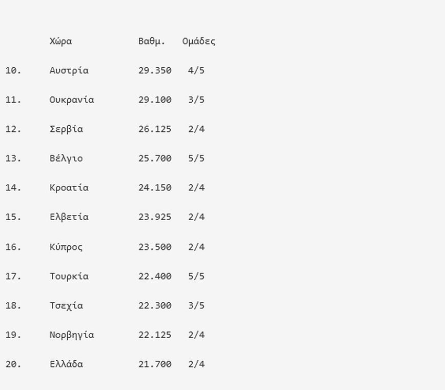 Η κατάταξη της UEFA, από την δέκατη μέχρι και την εικοστή θέση, έχει ως εξής: