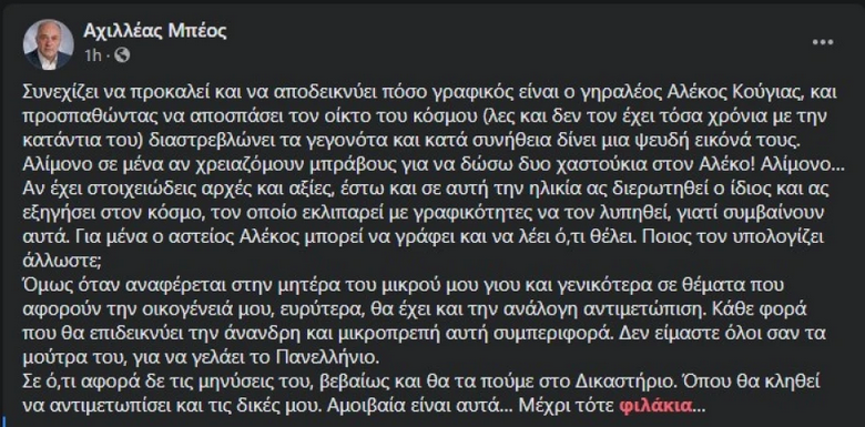 «Συνεχίζει να προκαλεί και να αποδεικνύει πόσο γραφικός είναι ο γηραλέος Αλέκος Κούγιας, και προσπαθώντας να αποσπάσει τον οίκτο του κόσμου (λες και δεν τον έχει τόσα χρόνια με την κατάντια του) διαστρεβλώνει τα γεγονότα και κατά συνήθεια δίνει μια ψευδή εικόνά τους. Αλίμονο σε μένα αν χρειαζόμουν μπράβους για να δώσω δυο χαστούκια στον Αλέκο! Αλίμονο…