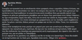 «Πριν από λίγο στο κατάστημα Gold Fish στην Σκιάθο έπινα καφέ με οπαδό της ΑΕΛ ο οποίος είναι λιμενικός στο επάγγελμα και το όνομα του είναι Αχιλλέας ο οποίος ήταν μαζί με τον 12χρονο γιό του, όταν από πίσω άνανδρα και χωρίς να τον αντιληφθώ με κτύπησε στο κεφάλι αυτό το “γνωστό” σε όλη την ελληνική κοινωνία και στο ελληνικό ποδόσφαιρο “άτομο” που έχει δυσφημίσει οτιδήποτε με το οποίο έχει έρθει σε επαφή.