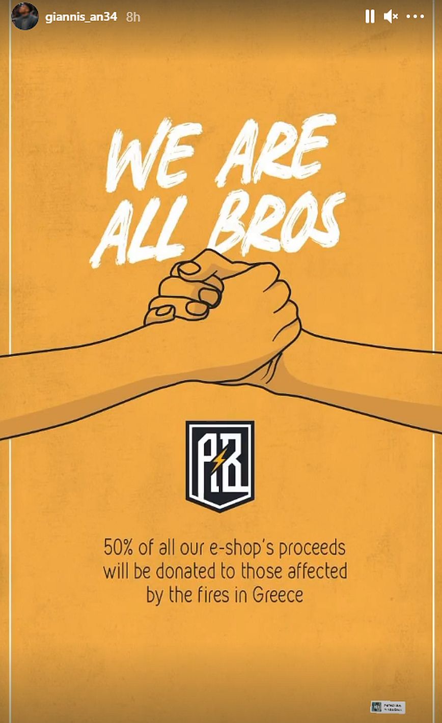 «Είμαστε όλοι αδέρφια. Το 50% των εσόδων από το e-shop θα γίνει δωρεά σε εκείνους που επλήγησαν από τις φωτιές στην Ελλάδα» αναφέρεται στην εικόνα που ανάρτησε ο Γιάννης Αντετοκούνμπο.