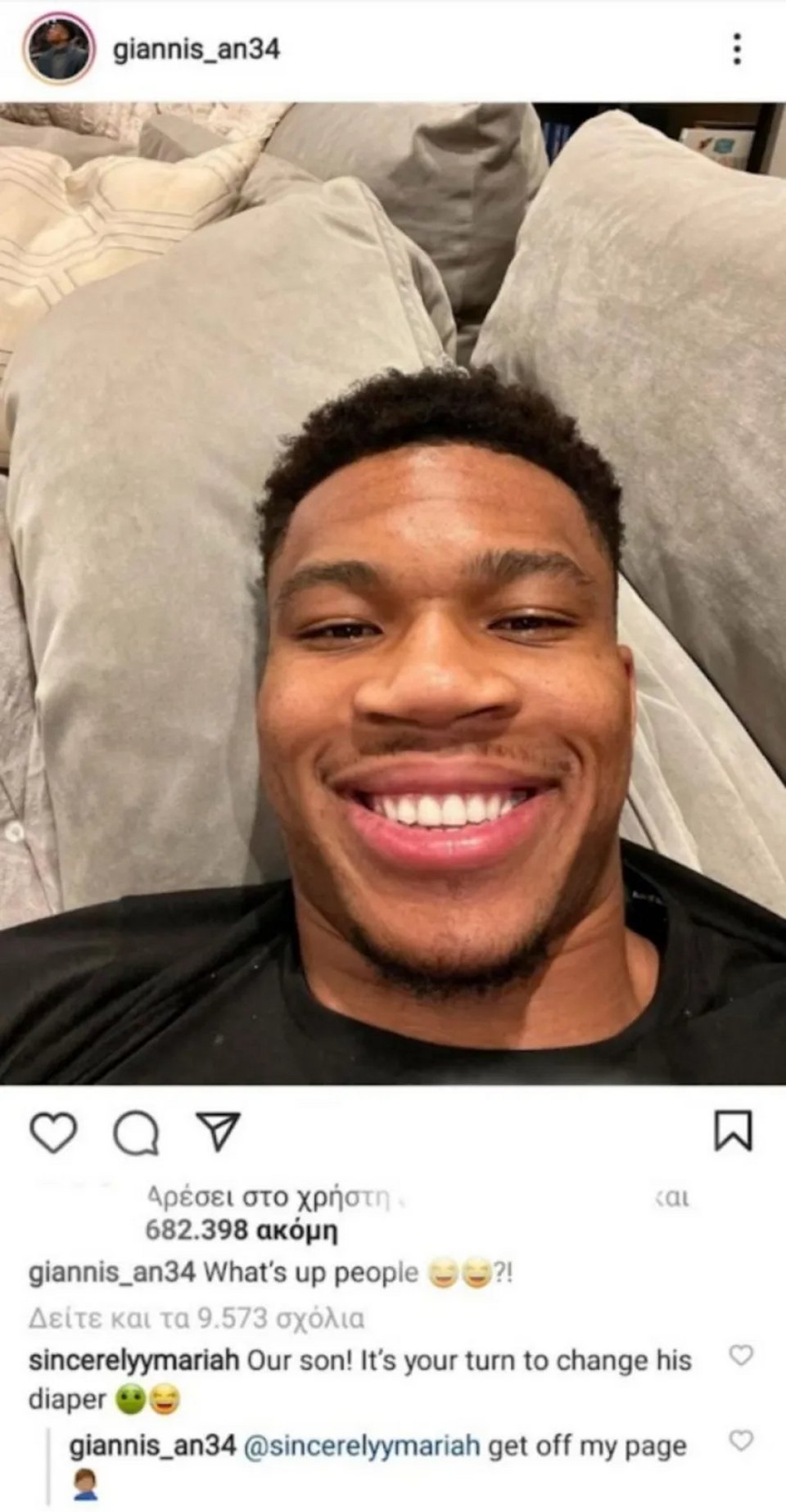 Ο Γιάννης ανέβασε μια selfie και ρώτησε όσους τον ακολουθούν «Τι νέα, παιδιά;». Η Μαράια από την πλευρά της του άφησε ένα σχόλιο, λέγοντάς του «…ο γιος μας, γιατί είναι η σειρά σου να αλλάξεις την πάνα». Ο Αντετοκούνμπο δεν το άφησε ασχολίαστο και με αρκετή δόση χιούμορ της είπε: «Φύγε από τη σελίδα μου!».