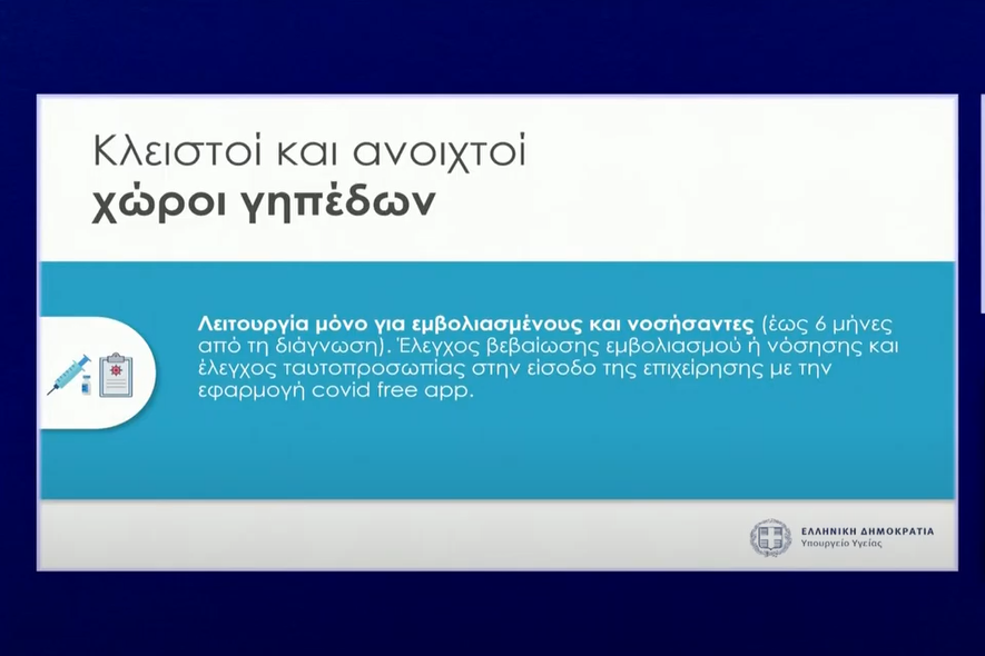Όπως σημείωσε ο υπουργός Υγείας, σε ό,τι αφορά τα κλειστά και ανοιχτά γήπεδα, όπως ήταν ήδη γνωστό, θα έχουν δικαίωμα εισόδου μόνο εμβολιασμένοι και νοσήσαντες ως έξι μήνες από τη διάγνωση.