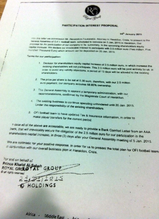Στο έγγραφο που φέρει την υπογραφή του Πρίγκιπα Καλίντ Μπιν Σαούντ Αλ-Σαμπάχ τονίζεται πως η συγκεκριμένη εταιρία προσφέρει 2,5 εκ. ευρώ για την αγορά του 68% των μετοχών του συλλόγου.