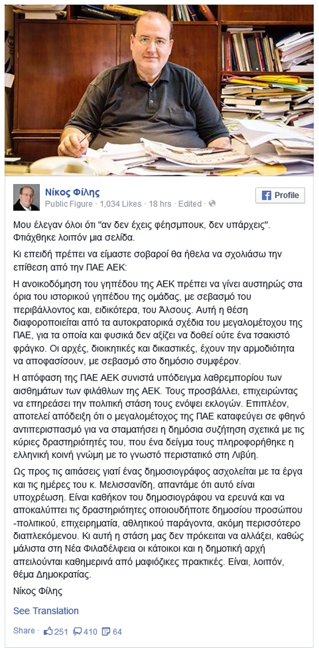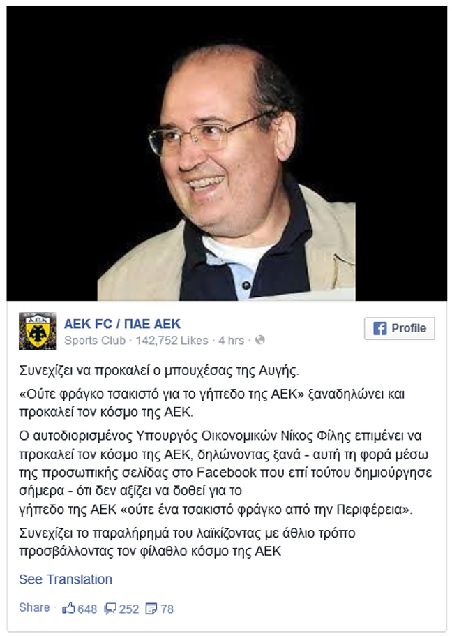 Συνεχίζεται ο πόλεμος της ΑΕΚ με τον διευθυντή της Εφημερίδας «Αυγής» και μέλος της Κεντρικής Επιτροπής του ΖΥΡΙΖΑ, έπειτα από τις δηλώσεις του στην τηλεοπτική εκπομπή «Ενικός» το βράδυ της Δευτέρας. O Νίκος Φίλης με νέα τοποθέτησή του, αυτή την φορά μέσω της σελίδας του στο «Facebook» (που «άνοιξε το βράδυ της Τετάρτης), εξαπέλυσε νέα επίθεση στον Δημήτρη Μελισσανίδη, επαναλαμβάνοντας πως δεν πρόκειται να «δοθεί ούτε φράγκο τσακιστό» από την Περιφέρεια Αττικής για την ανέγερση της «Αγιάς Σοφιάς».