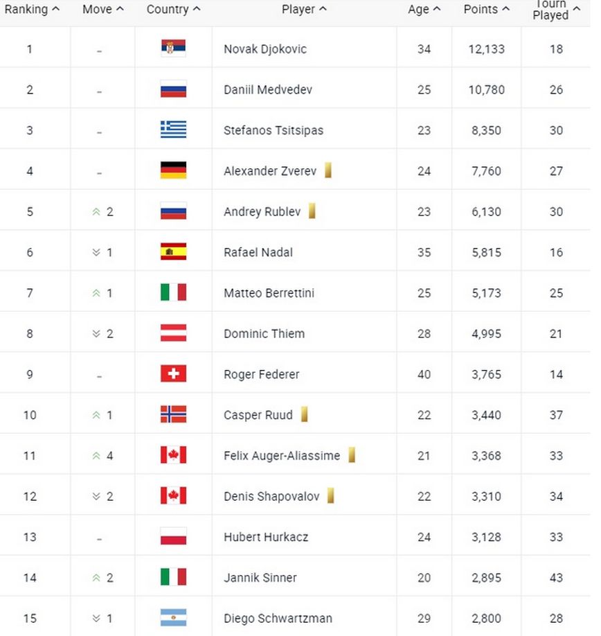 Ο Αντρέι Ρούμπλεφ κέρδισε δύο θέσεις και σκαρφάλωσε στο «5», ενώ έκτος υποχώρησε ο Ράφα Ναδάλ και ένατος είναι ο Ρότζερ Φέντερερ.