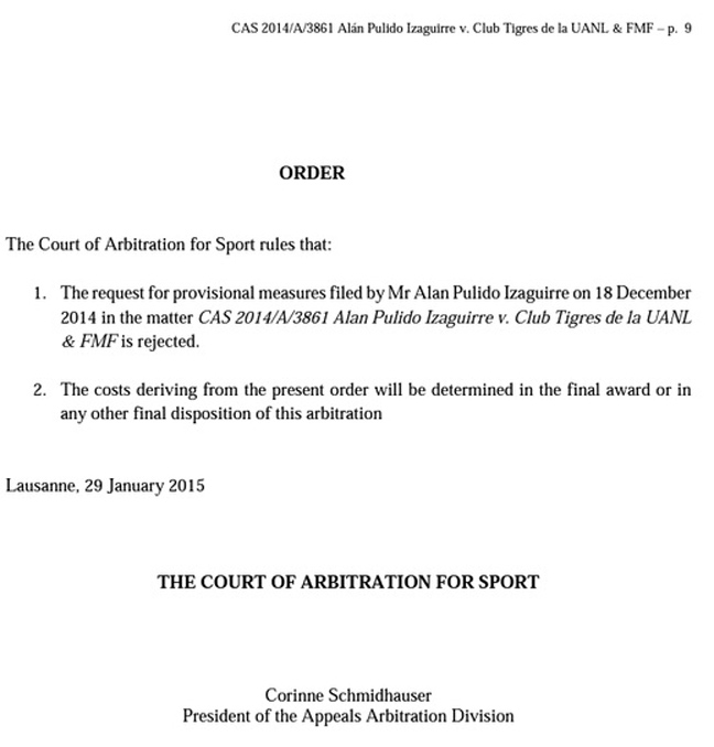 Κέρδισε και στο… CAS η Τίγκρες! Το Ανώτατο Διαιτητικό Δικαστήριο ανακοίνωσε την Τρίτη (3/2) πως απέρριψε την έφεση που άσκησε ο Άλαν Πουλίδο, δικαιώνοντας τη μεξικανική ομάδα!