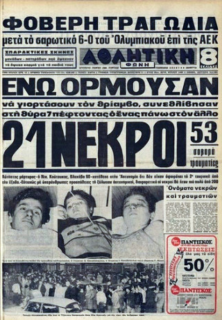 Ενδεικτικό είναι το πρωτοσέλιδο της εφημερίδας «Φως» όπου έγραφε: «19 νεκροί (σσ: δυο ακόμα άτομα υπέκυψαν στα τραύματά τους τις επόμενες ημέρες) και 54 τραυματίες» και σχεδόν με το ίδιο μέγεθος γραμμάτων «Ο Ολυμπιακός σκόρπισε την ΑΕΚ 6-0 παίζοντας φανταστική μπάλα σε ρυθμό βραζιλιάνικο».