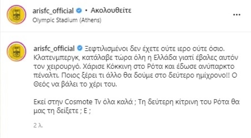 ««Ξεφτιλισμένοι δεν έχετε ούτε ιερό ούτε όσιο. Κλατενμπεργκ, κατάλαβε τώρα όλη η Ελλάδα γιατί έβαλες αυτόν τον χειρουργό. Χάρισε Κόκκινη στο Ρότα και έδωσε ανύπαρκτο πέναλτι. Ποιος ξέρει τι άλλο θα δούμε στο δεύτερο ημίχρονο!! Ο Θεός να βάλει το χέρι του. Εκεί στην Cosmote Tv όλα καλά ; Τη δεύτερη κίτρινη του Ρότα θα μας τη δείξετε ; Ε ;».