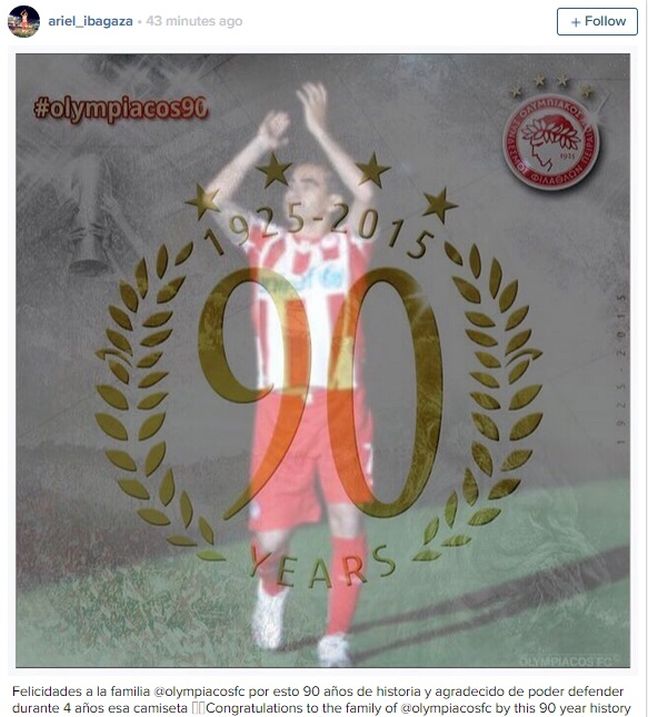 «Συγχαρητήρια στην οικογένεια του Ολυμπιακού για τα 90 χρόνια ιστορίας. Είμαι ευγνώμων που μπόρεσα να φορώ για πάνω από τέσσερα χρόνια αυτή τη φανέλα», έγραψε στο Instagram.