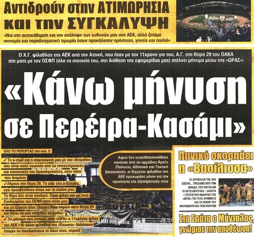 Σε μήνυση κατά του προπονητή του Ολυμπιακού, Βίτορ Περέιρα αλλά και του Παϊτίμ Κασάμι προχωράει οπαδός της ΑΕΚ που βρέθηκε την περασμένη βδομάδα μαζί με τον 11χρονο γιο του στο ΟΑΚΑ για να παρακολουθήσει το ντέρμπι.